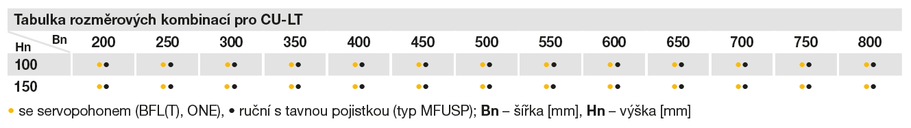![]() | Varianty Požární klapka CU-LT je dostupná v těchto provedeních. S tavnou pojistkou (typ MFUSP), která aktivuje uzavírací mechanismus při teplotě vyšší než 72 °C a servopohonem (typ ONE/BFL(T)). Lze osadit servopohon na 24 V nebo 230 V. Klapka je osazena revizním otvorem UL. | |