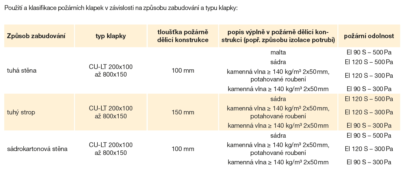 ![]() | Popis Čtyřhranné požární klapky CU-LT slouží jako uzávěr vzduchotechnického potrubí v případě požáru. Aktivací klapky je zabráněno po uvedenou dobu šíření zplodin hoření do vedlejšího požárního úseku. Plášť klapky je zhotoven z ocelového plechu chráněného antikorozní úpravou. Certifikace podle ČSN EN 15650. Klasifikace podle ČSN EN 13 501-3+A1. Požární odolnost klapky je EI60, EI90 nebo EI120 dle způsobu zabudování. Zkoušeno podle normy ČSN EN 1366-2 při 500 Pa. | |