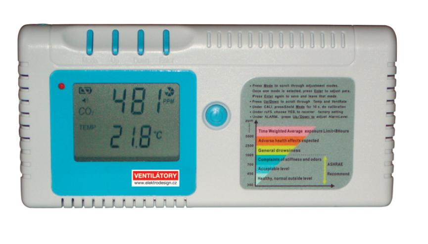 ![]() | Informace EDF-CO2-D je přenosné monitorovací zařízení pro přesné sledování CO2. Navíc vedle měření koncentrace CO2 umožňuje měřit i okolní teplotu. Pro zajištění dlouhodobé stability používá optickou technologii NDIR. Jedná se o malé stolní zařízení vhodné, spolu se síťovým zdrojem, k dennímu provozu v domácnostech. Zařízení má programovatelný alarm signalizující překročení koncentrace a paměť umožňující kontrolu denních průběhů hodnot. Funkce • Vestavěný záznamník může zaznamenat 48 hodnot CO2 a teploty za posledních 24 hodin; jeden záznam každých 30 minut. • Max/Min mód umožňuje zaznamenávat maximální a minimální koncentraci CO2 od posledního zapnutí. • Alarm mód zvukovým signálem indikuje koncentraci 1000 PPM, doporučený limit ASHRAE. Úroveň alarmu může být měněna a zvukovou indikaci je možné vypnout. • RCFS Mód slouží pro obnovení originálního továrního nastavení. Pozor Nelze použít jako spínací kontakt pro ovládání zařízení (pouze v případě použití volitelného příslušenství EDF-CO2-D-RE). | |