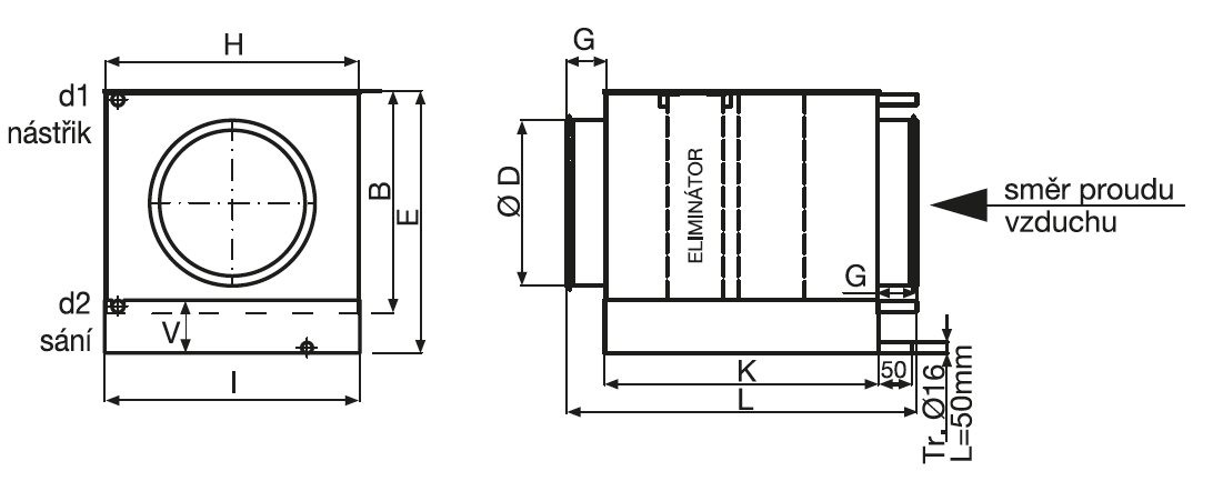 ![]() | Informace • je určen pro kruhové potrubí • plášť chladiče je z galvanizovaného plechu • vana pro odvod kondenzátu je hliníková • lamely jsou hliníkové na měděných trubičkách • připojení je kleštinovým přechodem se závitem, který není v dodávce nebo letováním (viz tabulka) • konstruován pro chladivo R410a • maximální pracovní tlak je 40 bar Instalace a provoz • doporučená čelní rychlost vzduchu pro MKF s integrovaným eliminátorem kapek je do 4 m/s, pro výpočet rychlosti vzduchu se uvažuje s průtočnou plochou výparníku, vyšší rychlosti konzultujte s technickým oddělením EDV • montáž výlučně v horizontální poloze • před chladič musí být instalován filtr vzduchu (ochrana před znečištěním) • chladič doporučujeme zařadit za ohřívač • při montáži je nutno pamatovat na vypouštění a plnění soustavy a zajištění přístupu pro servis • v rámci projekce je nutno chladič navrhnout s ohledem na množství vyvíjeného kondenzátu • odvod kondenzátu s pachovým sifonem je třeba kontrolovat s ohledem na možnost vysychání a zajistit dostatečnou výšku vodního sloupce pro překonání tlakové ztráty sifonu • pro zjištění minimálního bezpečného rozdílu hladin v sifonu lze orientačně postupovat tak, že se vezme celkový tlak ventilátoru Pt v mm vodního sloupce, tato hodnota se zvýší o cca 50 % (takto získaná hodnota představuje praktickou doporučenou hodnotu výšky vodního sloupce v sifonu, aby nemohlo dojít k překonání pachového uzávěru vyfouknutím přetlakem nebo vysáním podtlakem ventilátoru) • procházející vzduch nesmí obsahovat pevné, vláknité, lepivé a agresivní příměsi. Také musí být bez chemických látek, které způsobují korozi použitých materiálů, tj. narušují hliník, měd a zinek • na základě konzultace s technickým oddělením je možno nabídnout vhodný zdroj chladu UPOZORNĚNÍ Chladič musí být nainstalován do potrubní trasy s prouděním vzduchu ve směru šipky na skříni chladiče. Pokud je chladič namontován obráceně, kondenzát není sváděn do jímače a vytéká z chladiče ven. Pro spolehlivou funkci chladiče je nutno zajistit ochranu proti namrzání, případně regulaci výkonu (odmrazovací cyklus). V objednávce je nutno uvést požadavek na pravé nebo levé provedení. | |