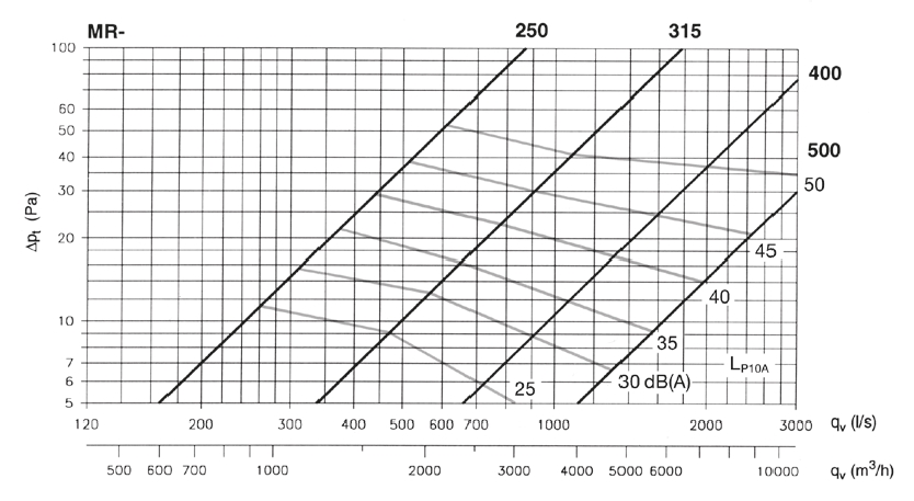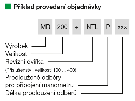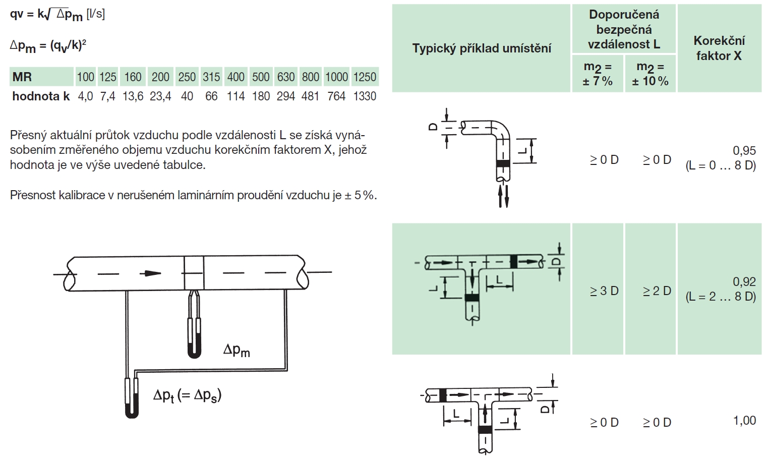 ![]() | Informace Měřící kruh MR je určen pro rychlá a přesná měření průtoku vzduchu pro kruhová potrubí. • funguje nezávisle na směru proudění vzduchu • pevná konstrukce • snadné čištění potrubí u verze s revizními dvířky Konstrukce Skříň měřícího kruhu MR je vyrobena z pozinkovaného ocelového plechu, měřící kruh a odběry pro připojení manometru jsou vyrobeny z hliníku. Revizní dvířka NTL jsou vyrobena z pozinkovaného plechu. Velikosti 100 ... 400 se dodávají s jednobřitým těsněním. Instalace Měřící kruh MR je k potrubí připojen pomocí nýtů nebo samořezných šroubů. Bližší informaci ohledně doporučovaného umístění v potrubním systému viz následující strana. Měření průtoku vzduchu MR je opatřen vývody pro připojení manometru pro měření tlakového rozdílu (pm), který se dá přímo použít k výpočtu hodnot průtoku vzduchu za použití hodnot konstanty k a korekčního faktoru X. Diagramy zde uvedené slouží pro volbu vhodné velikosti při uvažování tlakové ztráty pt. | |