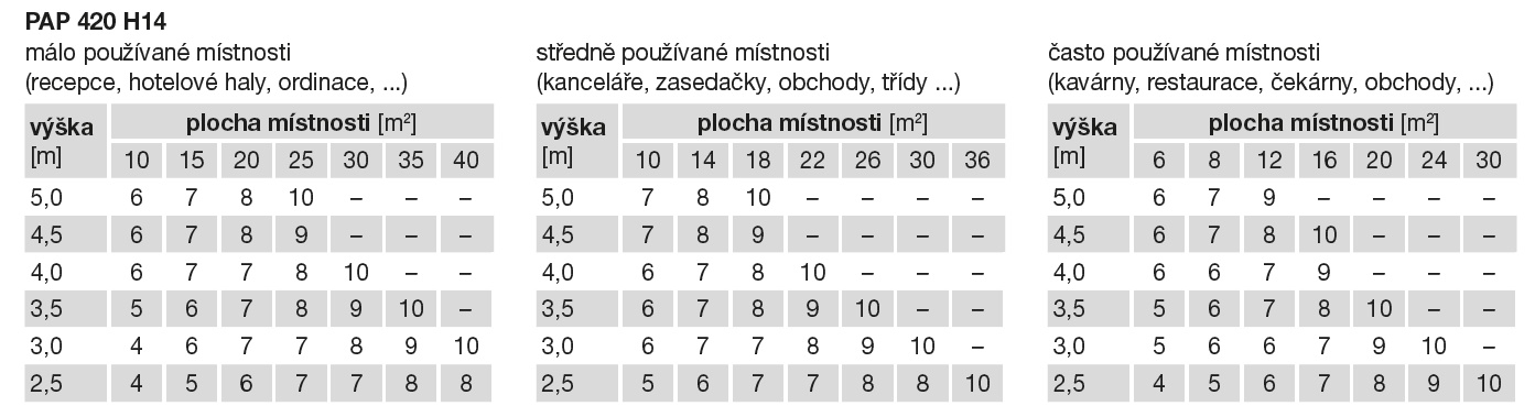 příslušenství - filtry | tabulky rychlého návrhu - nastavení potenciometru v závislosti na typu a ploše místnosti |