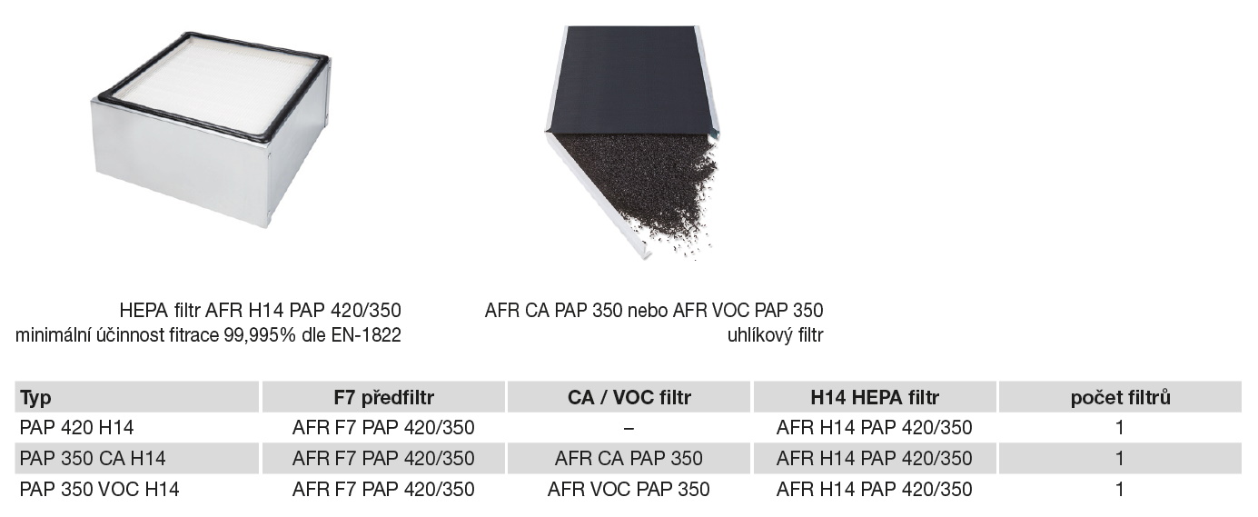 ![]() | Informace • robustní řešení pro profesionální použití • kolečka pro snadnou manipulaci • vestavěný difuzor pro rovnoměrnou distribuci čistého vzduchu v místnosti • vertikální výstup vzduchu • tichý chod • vhodná pro místnosti do 40 m2 • rámová konstrukce se sendvičovými panely s protihlukovou izolací tloušťky 18 mm • 3 typy filtrace • ovládání pomocí potenciometru • pro vnitřní použití Oběžné kolo ventilátoru je radiální s dozadu zahnutými lopatkami. Motor je bezkartáčový DC s vysokou účinností a nízkou spotřebou, napájení 230 V ± 10 %, 50 / 60Hz. Krytí IP44, kuličková ložiska, tepelná ochrana. Filtrace PAP 420 H14 – filtry F7 + H14 • prach, pyl, výtrusy, bakterie, viry a rozptýlené částice (PM1, PM2,5 a PM10) PAP 350 CA H14 – filtry F7 + uhlík. filtr + H14 • bakterie, viry, rozptýlené částice (PM1, PM2,5 a PM10) a pachy PAP 350 VOC H14 – filtry F7 + VOC Filtr + H14 • prach, pyl, výtrusy, bakterie, viry, rozptýlené částice (PM1, PM2,5 a PM10), pachy, formaldehyd, etylen, CO, SO2, NOX a VOC Nastavení průtoku pomocí potenciometru na čelním panelu. ON/OFF vypínač je integrovaný na zásuvce pro připojení síťového napájení. Síťový kabel je součástí dodávky.
