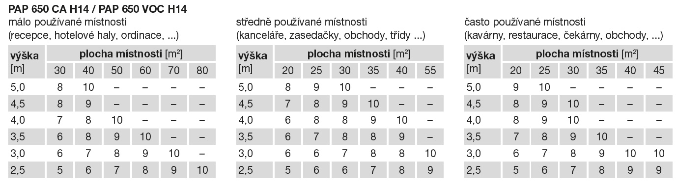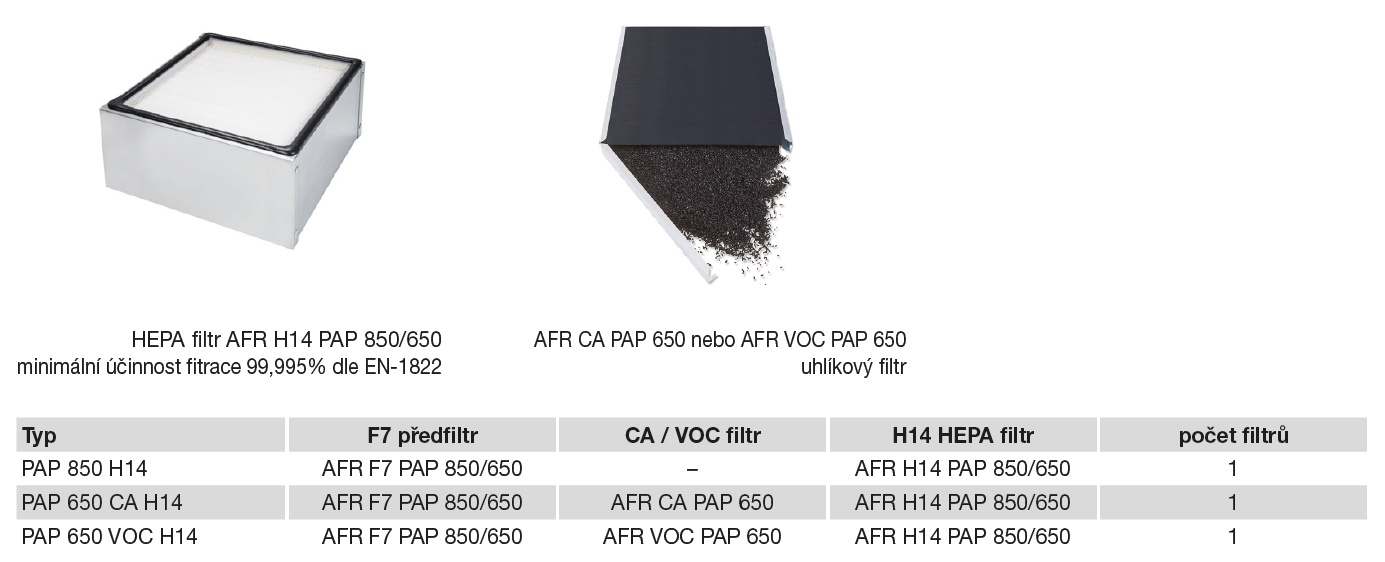 ![]() | Informace • robustní řešení pro profesionální použití, • kolečka pro snadnou manipulaci (dvě jsou opatřena brzdou) • vestavěný difuzor pro rovnoměrnou distribuci čistého vzduchu v místnosti • vertikální nebo horizontální výstup vzduchu • tichý chod, vhodná pro místnosti do 80 m2 • rámová konstrukce se sendvičovými panely s protihlukovou izolací tloušťky 25 mm • 3 typy filtrace • ovládání pomocí potenciometru • pro vnitřní použití Oběžné kolo ventilátoru je radiální s dozadu zahnutými lopatkami. Motor bezkartáčový DC s vysokou účinností a nízkou spotřebou, napájení 230 V ± 10 %, 50 / 60Hz. Krytí IP44, kuličková ložiska, tepelná ochrana. Filtrace PAP 850 H14 – filtry F7 + H14 • prach, pyl, výtrusy, bakterie, viry a rozptýlené částice (PM1, PM2,5 a PM10) PAP 650 CA H14 – filtry F7 + uhlík. filtr + H14 • bakterie, viry, rozptýlené částice (PM1, PM2,5 a PM10) a pachy PAP 650 VOC H14 – filtry F7 + VOC Filtr +H14 • prach, pyl, výtrusy, bakterie, viry, rozptýlené částice (PM1, PM2,5 a PM10), pachy, formaldehyd, etylen, CO, SO2, NOX a VOC Nastavení průtoku pomocí potenciometru na čelním panelu. ON/OFF vypínač je integrovaný na zásuvce pro připojení síťového napájení. Síťový kabel je součástí dodávky. | |