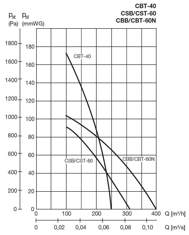 ![]() | Motor Motor je asynchronní s kotvou nakrátko, kuličková ložiska s tukovou náplní na dobu životnosti. Motor mimo proud vzdušiny. Krytí IP55, třída izolace F (modely CSB, CST a CBT-40 krytí IP44, třída izolace B). | |