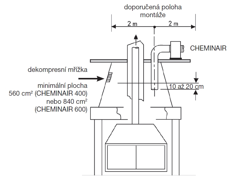 ![]() | Montáž Montáž ventilátoru v každé poloze osy motoru. Montuje se především v podstřešku a přibližně ve vzdálenosti 2 m vzhledem k ose sacího potrubí. Musí být umístěn na pevnou podložku, například 2 pevné desky, mezi něž je vložena zhruba 5 cm silná nehořlavá polotuhá izolace. CHEMINAIR nesmí být pokryt izolační vrstvou, aby se umožnila přirozená ventilace motoru. | |