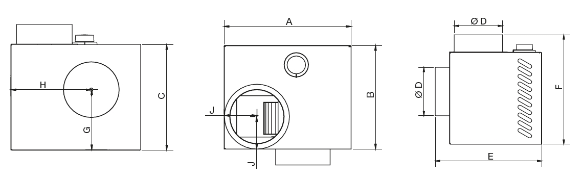 ![]() | Skříň Skříň je z pozinkovaného ocelového plechu a je opatřena tepelnou izolací. Oběžné kolo je od motoru odděleno izolovanou přepážkou. Na plášti ventilátoru je umístěn ovládací prvek termostatu. Tepelné čidlo je umístěno na výtlaku ventilátoru a má rozsah 0–90 °C. | |