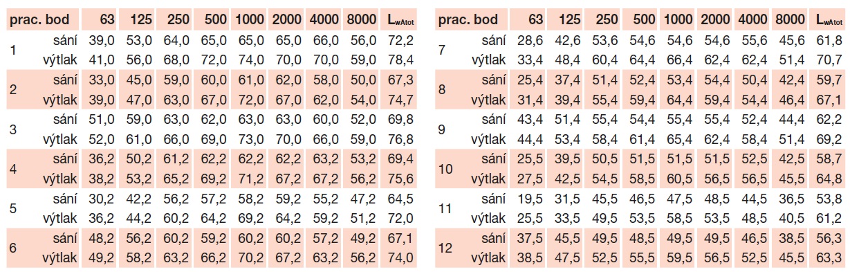 * akustický tlak měřen ve vzdálenosti 4 m, střešní ventilátor je nainstalován, měřeno v pracovních bodech výkonové křivky 2, 5, 8 a 11