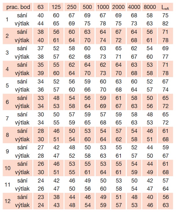 * akustický tlak je měřen ve vzdálenosti 3 m v bodě 2 výkonové křivky (sání/výtlak)