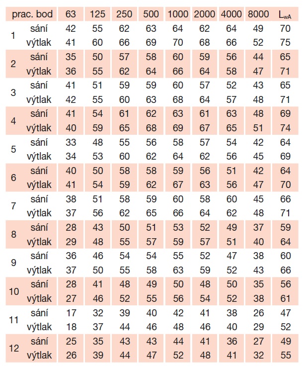 * akustický tlak je měřen ve vzdálenosti 3 m v bodě 2 výkonové křivky (sání/výtlak); ** hodnota v závorce platí v případě regulace otáček napětím