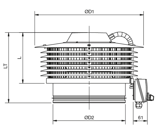 ![]() | Svorkovnice Svorkovnice s revizním vypínačem je umístěna na skříni ventilátoru. Krytí IP55. | |