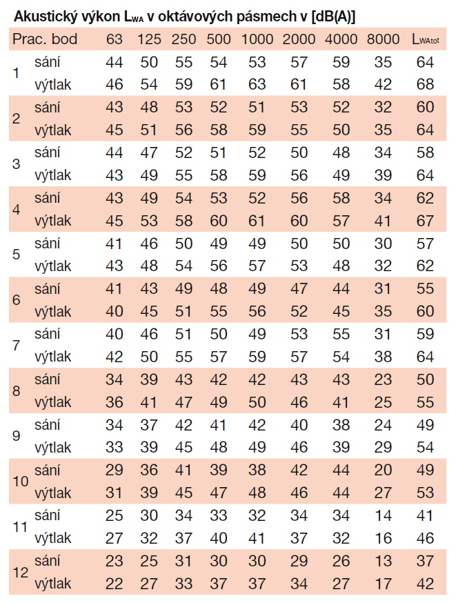 ![]() | Hluk Hluk emitovaný ventilátorem je uveden v tabulkách. Hodnoty LpA na výkonových charakteristikách jsou měřeny ve volném poli na straně sání ve vzdálenosti 1,5 m. | |