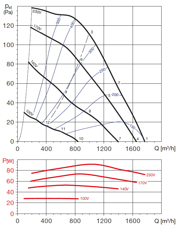 otáčky [min-1] | příkon [W] | proud [A] | průtok (0 Pa) [m3/h] | napětí [V] | teplota [°C] | akust. tlak - sání [dB(A)] | akust. tlak - výtlak [dB(A)] | hmot. [kg] | velikost přísl. | regulátor |
