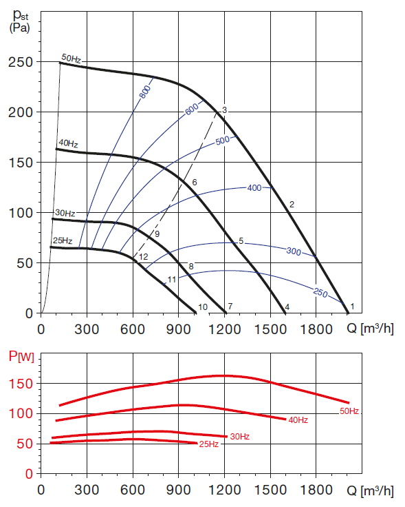 otáčky [min-1] | příkon [W] | proud [A] | průtok (0 Pa) [m3/h] | napětí [V] | teplota [°C] | akust. tlak - sání [dB(A)] | akust. tlak - výtlak [dB(A)] | hmot. [kg] | velikost přísl. | regulátor |