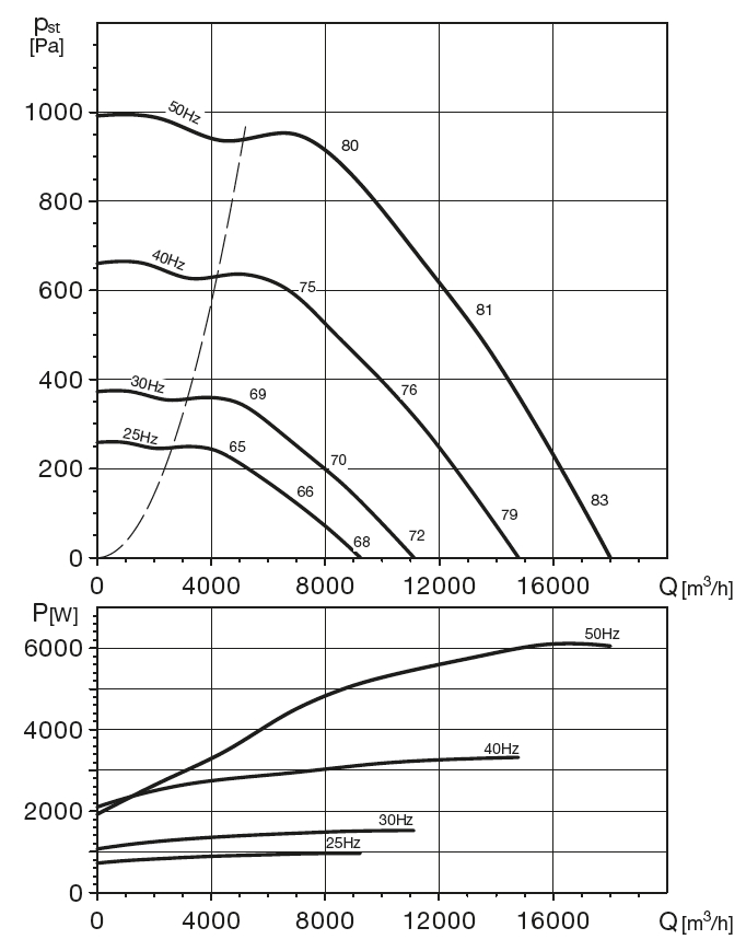 ![]() | Regulace otáček Regulace otáček se provádí výhradně frekvenčními měniči (nutné vybavení PTC termistorem). V režimu odvodu tepla a kouře regulace nepřípustná. | |
