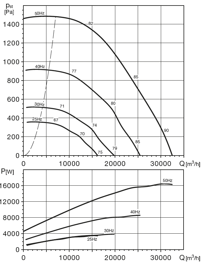 ![]() | Regulace otáček Regulace otáček se provádí výhradně frekvenčními měniči (nutné vybavení PTC termistorem). V režimu odvodu tepla a kouře regulace nepřípustná. | |