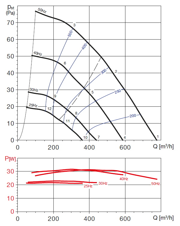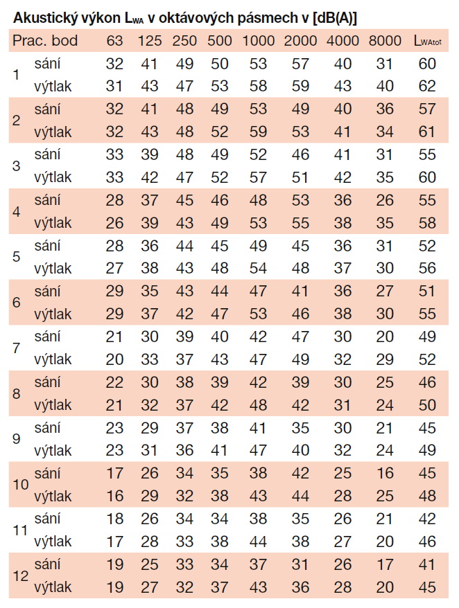 ![]() | Hluk Hluk emitovaný ventilátorem je uveden v tabulkách. Hodnoty LpA na výkonových charakteristikách jsou měřeny ve volném poli na straně sání ve vzdálenosti 1,5 m. | |