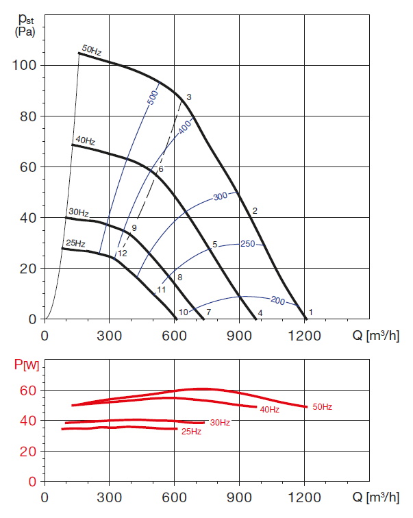 otáčky [min-1] | příkon [W] | proud [A] | průtok (0 Pa) [m3/h] | napětí [V] | teplota [°C] | akust. tlak - sání [dB(A)] | akust. tlak - výtlak [dB(A)] | hmot. [kg] | velikost přísl. | regulátor |