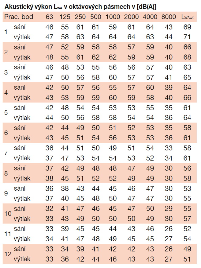 ![]() | Hluk Hluk emitovaný ventilátorem je uveden v tabulkách. Hodnoty LpA na výkonových charakteristikách jsou měřeny ve volném poli na straně sání ve vzdálenosti 1,5 m. | |