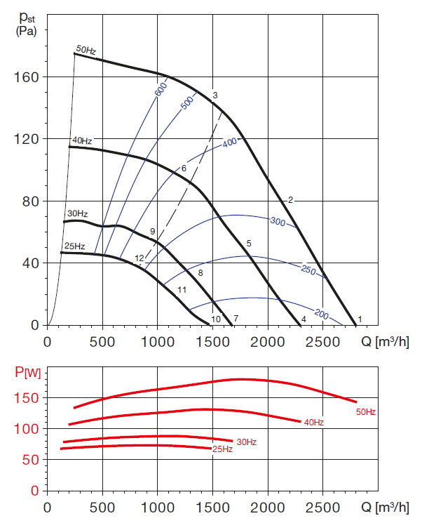 otáčky [min-1] | příkon [W] | proud [A] | průtok (0 Pa) [m3/h] | napětí [V] | teplota [°C] | akust. tlak - sání [dB(A)] | akust. tlak - výtlak [dB(A)] | hmot. [kg] | velikost přísl. | regulátor |