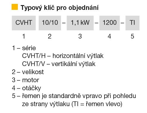 ![]() | Skříň Skříň je z ocelového, galvanicky pozinkovaného plechu sendvičového provedení s hliníkovými rohovníky. Ve spodní části jsou montážní patky pro uchycení ventilátoru k podlaze nebo stropu. Provedení s horizontálním výtlakem CVHT-H nebo vertikálním výtlakem CVHT-V. Motor s řemenovým převodem je uložen uvnitř skříně a standardně je na pravém boku skříně při pohledu ze strany výtlaku, alternativně lze dodat motor nalevo (CVHT/H-TI nebo CVHT/V-TI). | |