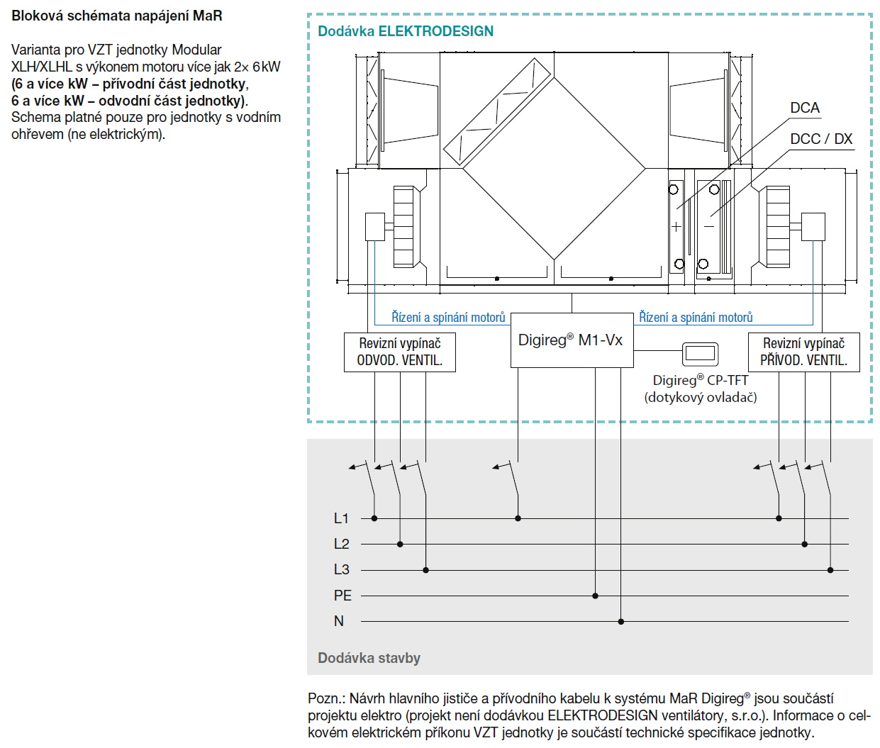 ![]() | El. připojení Napájecí napětí je 3× 400 V/50 Hz nebo 1× 230 V/50 Hz dle provedení jednotky a typu použitých ventilátorů. Přívodní kabely, kabely k čidlům a silové kabely se do jednotky přivádějí přes plastové průchodky ve stěně jednotky. Součástí dodávky nejsou jisticí prvky a přívodní kabel pro přívodní a odvodní ventilátory a hlavní jistič s přívodním kabelem rozvaděče MaR u motorů ventilátorů s výkonem vyšším než 6 kW na přívodu a 6 kW na odvodní straně. Jištění a napájení přívodních a odvodních ventilátorů a hlavního rozvaděče MaR je součástí dodávky stavby. Schéma napájení jednotek je uvedeno níže. | |