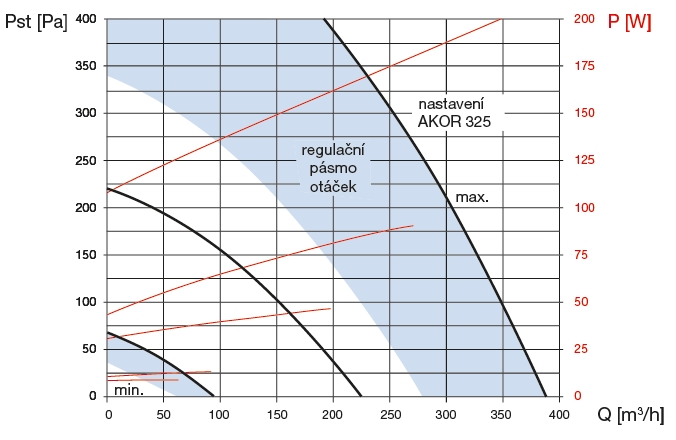 ![]() | Regulace otáček V tabulce a grafu je znázorněno tovární nastavení otáček, ty lze ale po montáži přizpůsobit dle potřeby. Jednotka je vybavena dvěma potenciometry, kterými lze nastavit hodnotu vysokých a nízkých otáček. Střední otáčky jsou pak průměrem hodnoty vysokých a nízkých otáček. Pro nejvyšší otáčky lze nastavit doběh od 10, 20 nebo 30 min, pokud je použit bezdrátový přepínač otáček typu RFT Akor, který je volitelným příslušenstvím. Přepínač pracuje na frekvenci 868 MHz s maximálním dosahem 100 m ve volném prostoru. V případě změny připojovacího kabelu na pětižilový (součást dodávky) lze zajistit ovládání přepínačem SA 1–3V (nebo obdobným). V tomto zapojení lze použít pro nezávislé spuštění nejvyšších otáček čidlo kvality vzduchu AIRSENS, pokojový termostat nebo programovatelný časový spínač DT 3R, DT 4 nebo DT 8-R, které přivedou fázové napětí ze stejné napájecí fáze na ovládací svorku (toto řešení je zákaznické a není součástí dodávky). Plná funkce mikroprocesorové regulace nastává 24 h po zapnutí a ustálení parametrů. | |