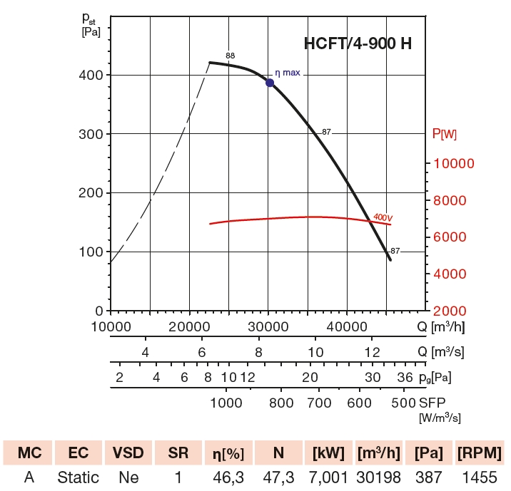 otáčky [min-1] | průtok (0 Pa) [m3/h] | výkon [W] | napětí [V] | proud [A] | max. teplota [°C] | akust. tlak [dB(A)] | hmotnost [kg] | regulátor |