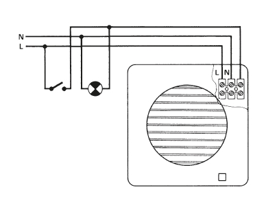 ![]() | Svorkovnice Svorkovnice je přístupná po sejmutí čelní mřížky ventilátoru. Připojení je kabelem pod omítkou nebo po omítce. Svorkovnice obsahuje odlehčovací sponu proti vytržení kabelu. | |
