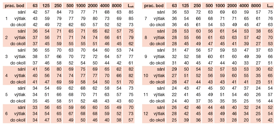 * výtlak/sání/do okolí. Akustický tlak je měřen ve vzdálenosti 1,5 m ve volném akustickém poli, ve středním pracovním bodě výkonové křivky