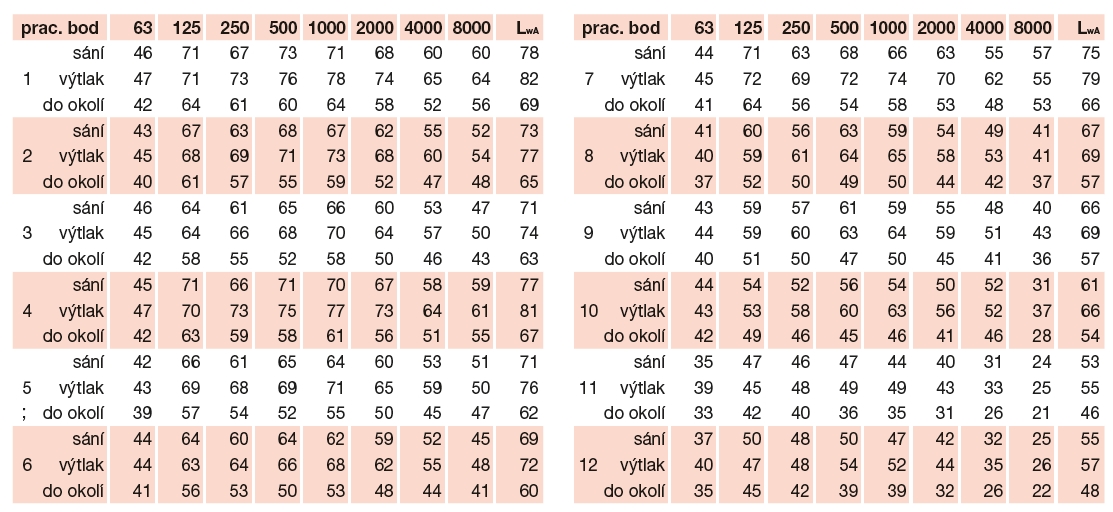 * výtlak/sání/do okolí. Akustický tlak je měřen ve vzdálenosti 1,5 m ve volném akustickém poli, ve středním pracovním bodě výkonové křivky