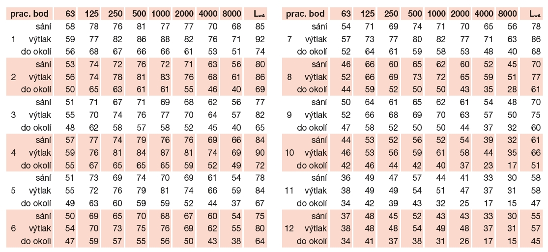 * výtlak/sání/do okolí. Akustický tlak je měřen ve vzdálenosti 1,5 m ve volném akustickém poli, ve středním pracovním bodě výkonové křivky