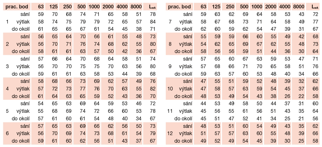 * výtlak/sání/do okolí. Akustický tlak je měřen ve vzdálenosti 1,5 m ve volném akustickém poli, ve středním pracovním bodě výkonové křivky