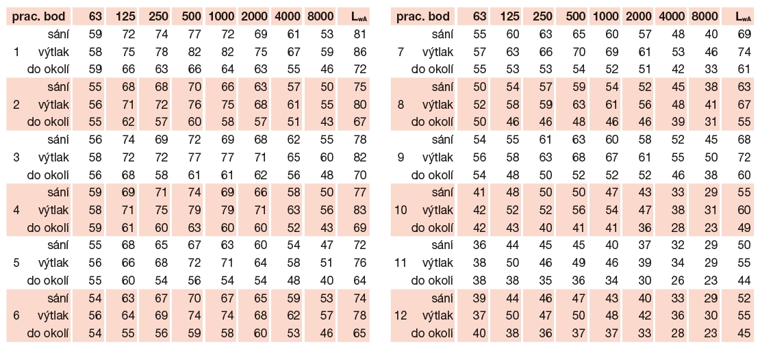 * výtlak/sání/do okolí. Akustický tlak je měřen ve vzdálenosti 1,5 m ve volném akustickém poli, ve středním pracovním bodě výkonové křivky