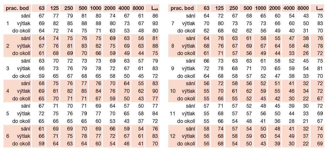 * výtlak/sání/do okolí. Akustický tlak je měřen ve vzdálenosti 1,5 m ve volném akustickém poli, ve středním pracovním bodě výkonové křivky