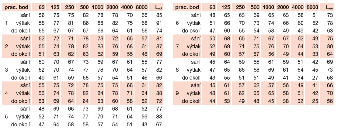 * výtlak/sání/do okolí. Akustický tlak je měřen ve vzdálenosti 1,5 m ve volném akustickém poli, ve středním pracovním bodě výkonové křivky