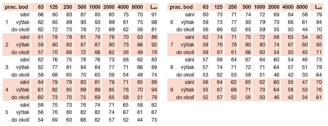 * výtlak/sání/do okolí. Akustický tlak je měřen ve vzdálenosti 1,5 m ve volném akustickém poli, ve středním pracovním bodě výkonové křivky