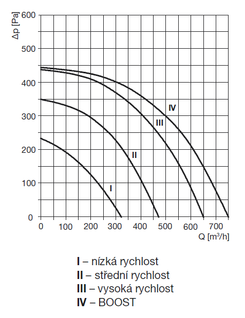 max. průtok [m3/h] | Ø připojení [mm] | počet motorů | rychlosti | napětí [V] | výkon [W] | proud [A] | akust. tlak* [dB(A)] |