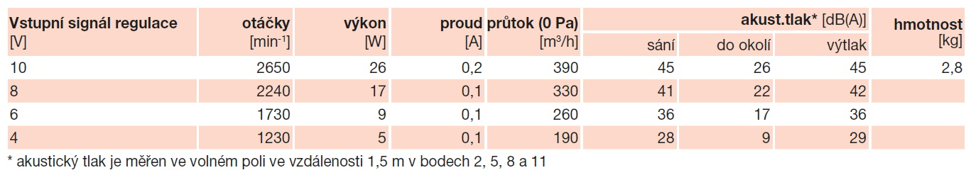 otáčky [min-1] | výkon [W] | napětí [V] | proud [A] | průtok (0 Pa) [m3/h] | teplota [°C] | akust. tlak* [dB(A)] | hmotnost [kg] | regulace [kg] |