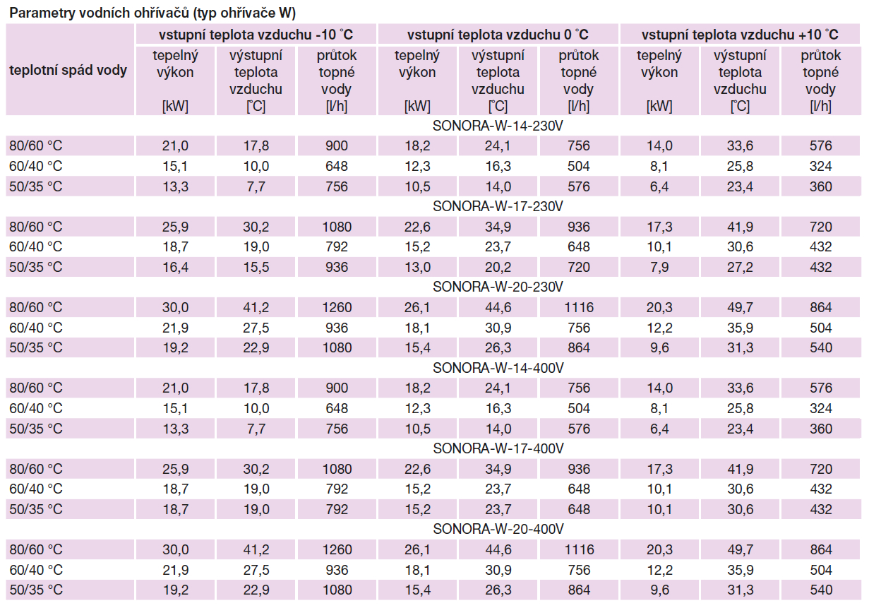 1 - 80/60 °C*, 2 - 60/40 °C**, 3 - 50/35 °C**; * parametry vodních ohřívačů jsou vypočteny pro uvedené teplotní spády, vstupní teplotu vzduchu +15 ˚C a maximální vzduchový výkon; ** parametry vodních ohřívačů jsou vypočteny pro uvedené teplotní spády, vstupní teplotu vzduchu +10 ˚C a maximální vzduchový výkon; *** zapojení Δ/Y