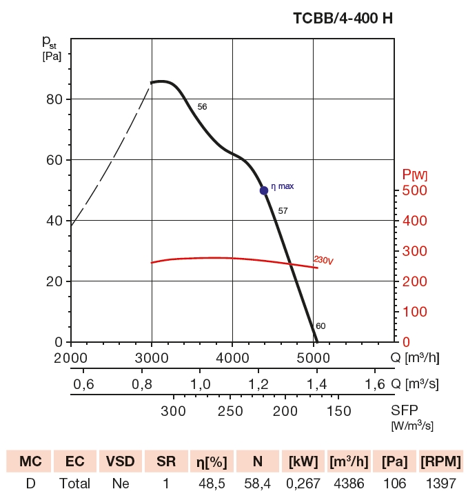 otáčky [m-1] | průtok (0 Pa) [m3/h] | výkon [W] | napětí [V] | proud [A] | max. teplota [°C] | akustický tlak* [dB(A)] | hmotnost [kg] | regulátor |