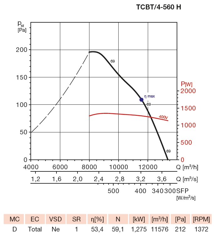 otáčky [m-1] | průtok (0 Pa) [m3/h] | výkon [W] | napětí [V] | proud [A] | max. teplota [°C] | akustický tlak* [dB(A)] | hmotnost [kg] | regulátor |