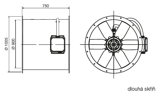 otáčky [min-1] | počet listů | příkon [kW] | napětí [V] | proud [A] | průměr připojení [mm] | hmotnost krátká skříň [kg] | hmotnost dlouhá skříň [kg] |