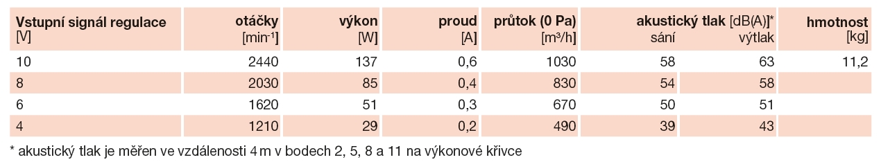 otáčky [min-1] | výkon [W] | napětí [V] | proud [A] | průtok (0 Pa) [m3/h] | akust. tlak* [dB(A)] | hmotnost [kg] | regulace |