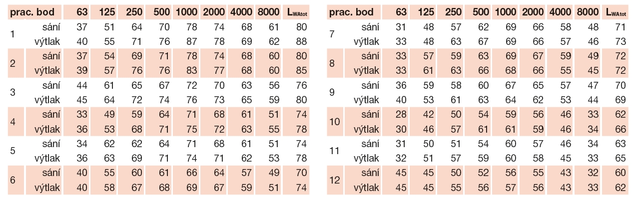 * sání/výtlak. Akustický tlak je měřen ve vzdálenosti 4 m v bodech 2, 5, 8 a 11 na výkonové křivce.