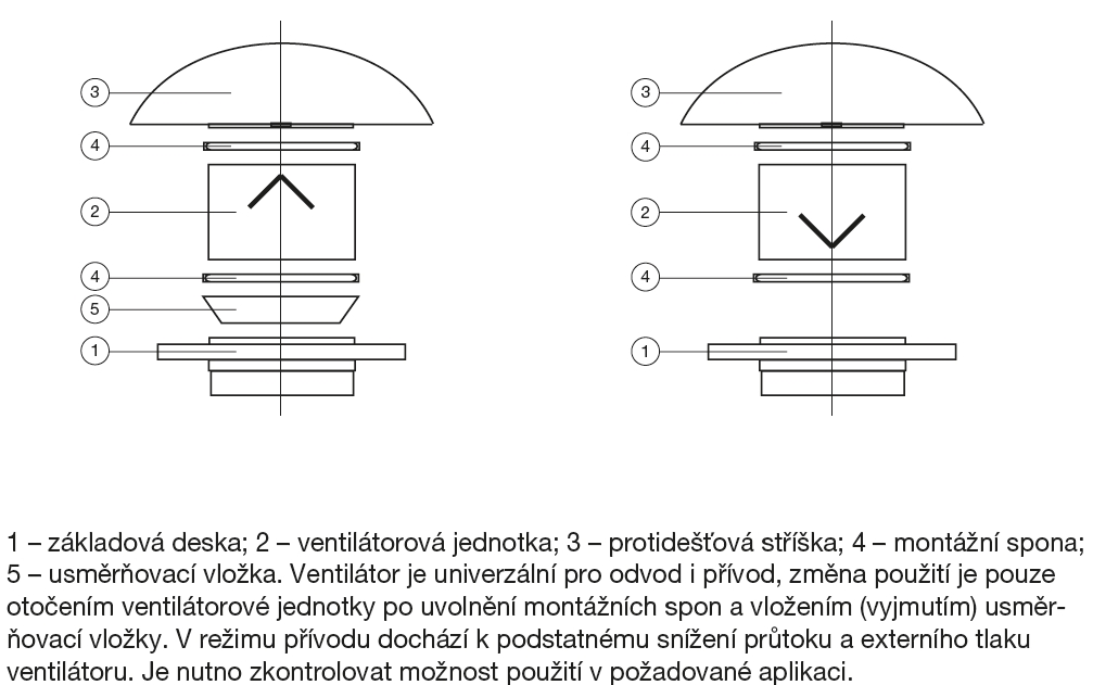 ![]() | Pokyny Ventilátor je univerzální pro odvod i přívod. Standardně se dodává jako odvodní, změna použití je pouze otočením ventilátorové jednotky po uvolnění montážních spon a vložením (vyjmutím) usměrňovací vložky. | |
