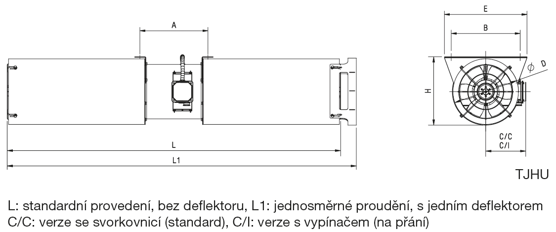 ![]() | Směr průtoku Směr průtoku je od oběžného kola k motoru, směr je vyznačen šipkou na skříni. Reverzování u typu TJHT je možné v souladu s dokumentací, která je součástí dodávky. Typ TJHU je jednosměrný. | |