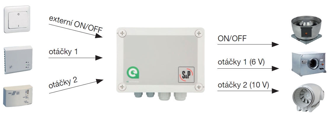 ![]() | Informace Regulátor je určen pro EC ventilátory řady Ecowatt. Jedná se o zařízení, které zjednodušuje regulaci řízeného větrání s jednoduchým nastavením a obsluhou. Výhodou jsou 3 digitální vstupy, které mohou být kombinovány pro různé režimy zajištující dvourychlostní nebo třírychlostní režim EC ventilátorů. Digitální vstupy lze využít pro připojení senzorů CO2, vlhkosti, teploty nebo PIR (pohybový senzor). Pomocí tří potenciometrů ve skříni regulátoru můžete nastavit řídicí analogový výstup pro daný digitální vstup. • krytí IP54 • napětí 230 V / 50 Hz, max. 3 A • ON/OFF vypínač • +24 V DC výstupní napětí • výstupní řídící analogový signál 0 –10 V • 3× digitální vstup pro nastavení až 3 rychlostí nebo 2 rychlostí a ON/OFF • externí vypnutí/zapnutí pomocí digitálního signálu (doběh, infračervené čidlo, řídící systémy budov ...) | |