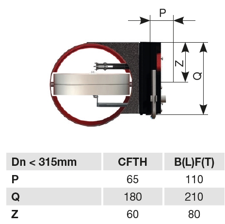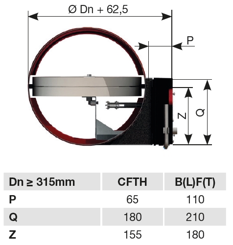 ![]() | Varianty Klapka je dostupná ve třech provedeních. S tavnou pojistkou (typ CFTH), která aktivuje uzavírací mechanismus při teplotě vyšší než 72 °C, servopohonem (typ BLF) nebo se servopohonem s termoelektrickou pojistkou (typ B(L)F(T)). Lze osadit servopohon na 24 V nebo 230 V. Klapka je osazena revizním otvorem UL. | |