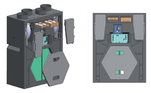 ![]() | Rekuperace Protiproudý deskový výměník je z plastu, účinnost až 92 %. Výměník je přístupný po demontáži čelní stěny jednotky. Pro letní provoz je jednotka vybavena obtokem výměníku. | |